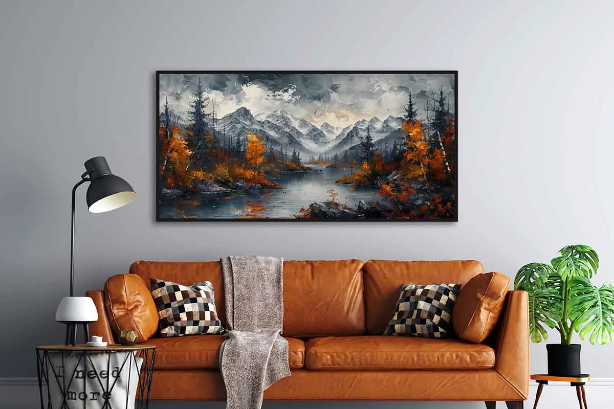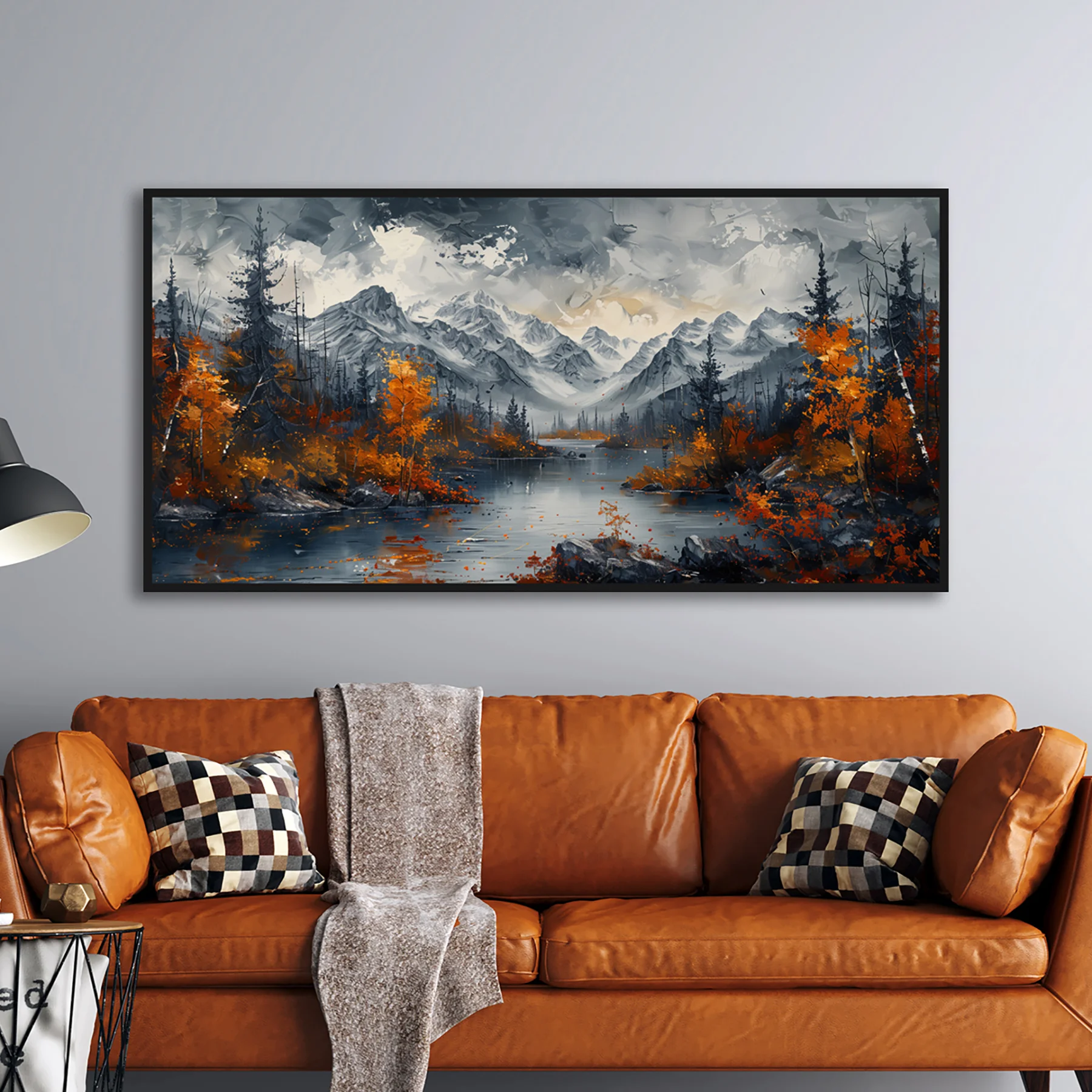 Yağlı Boya Dokulu Tablo Modern Karlı Doğan Manzarası Siyah Çerçeveli