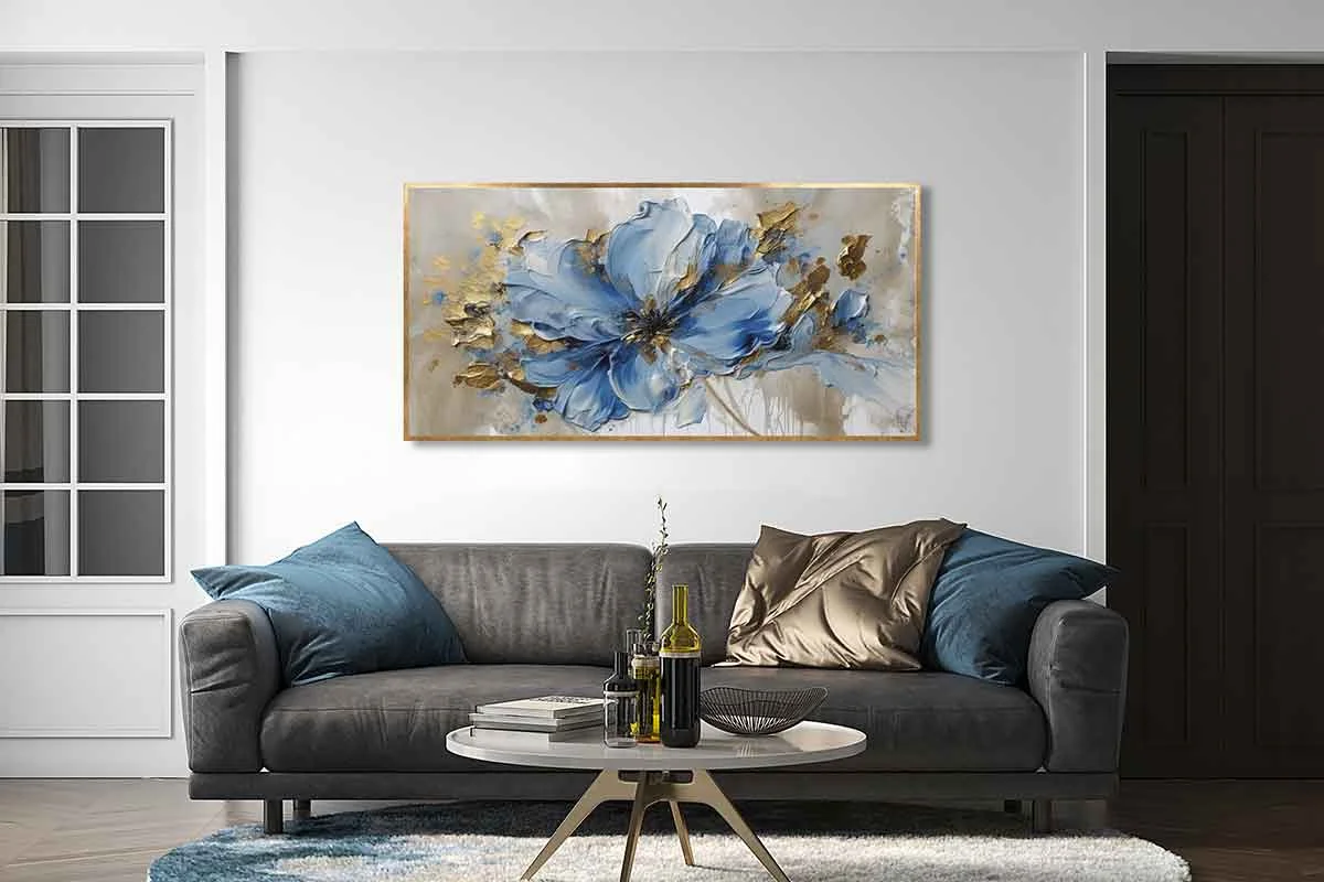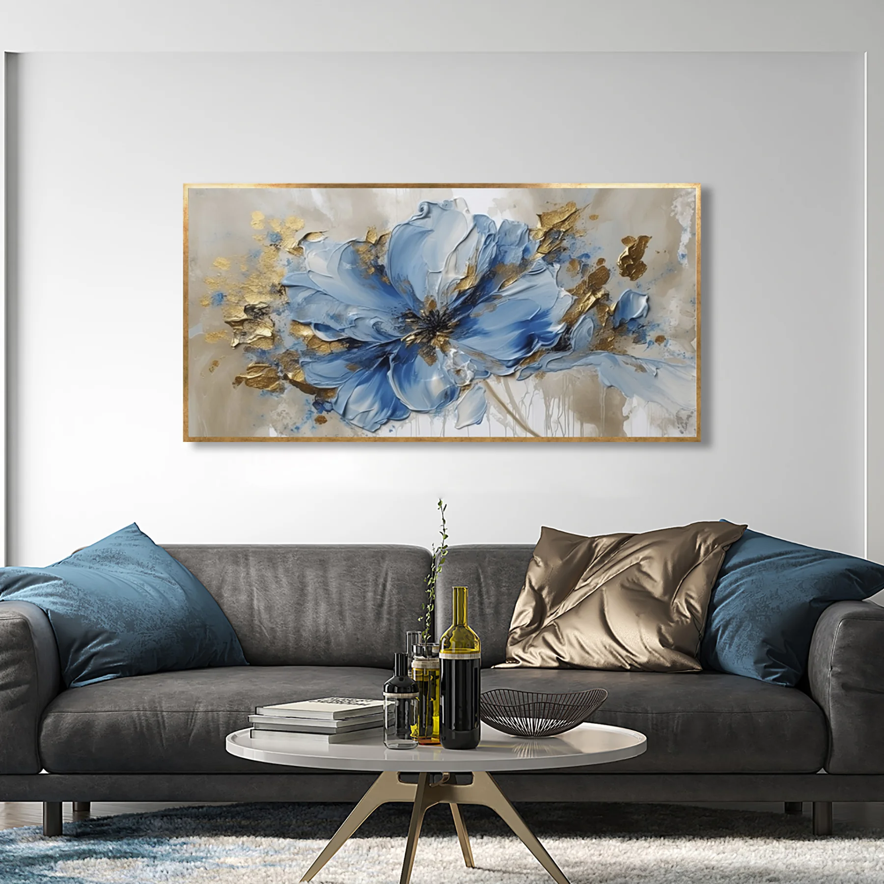 Yağlı Boya Dokulu Tablo Modern Mavi Tek Çiçek Altın Çerçeveli
