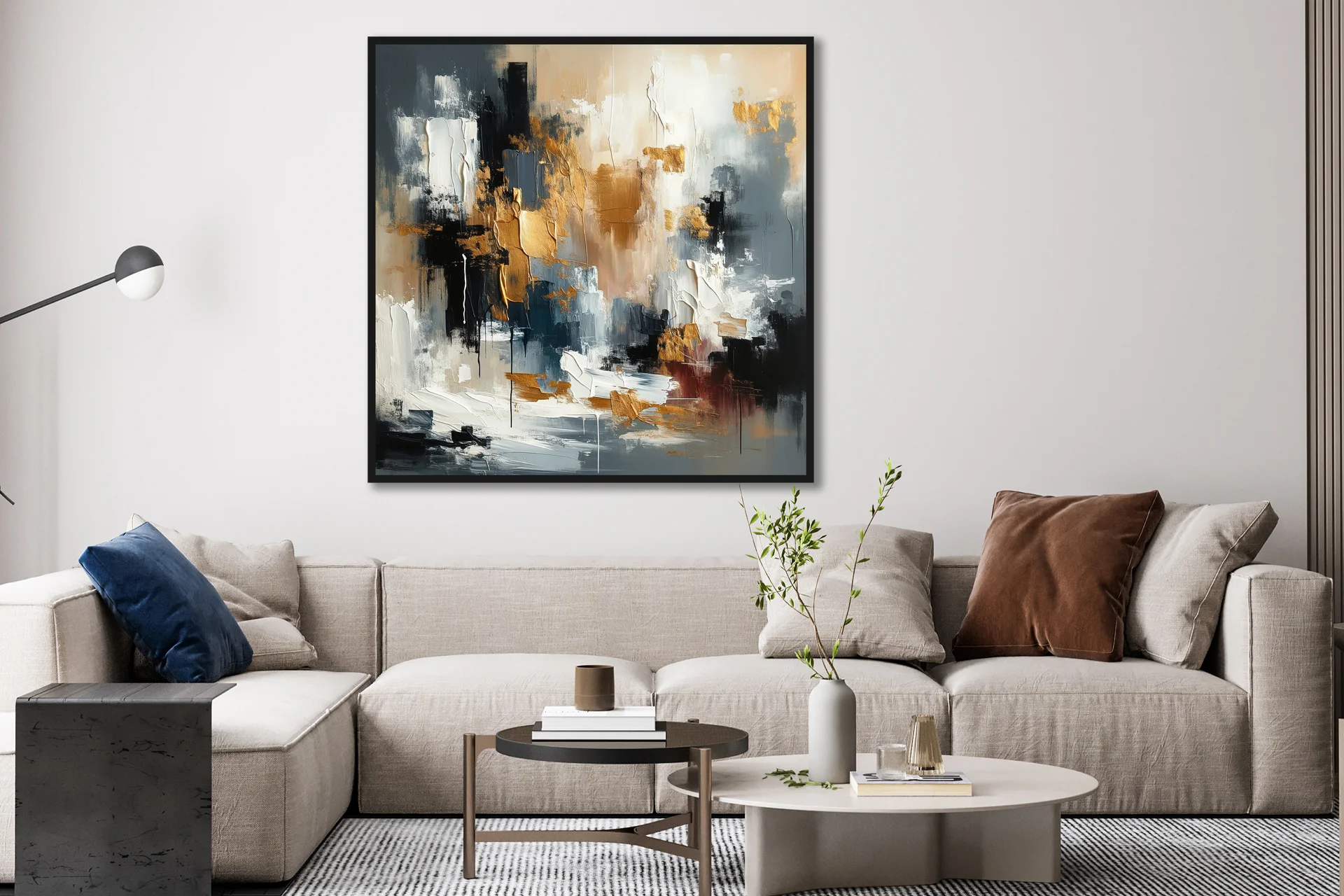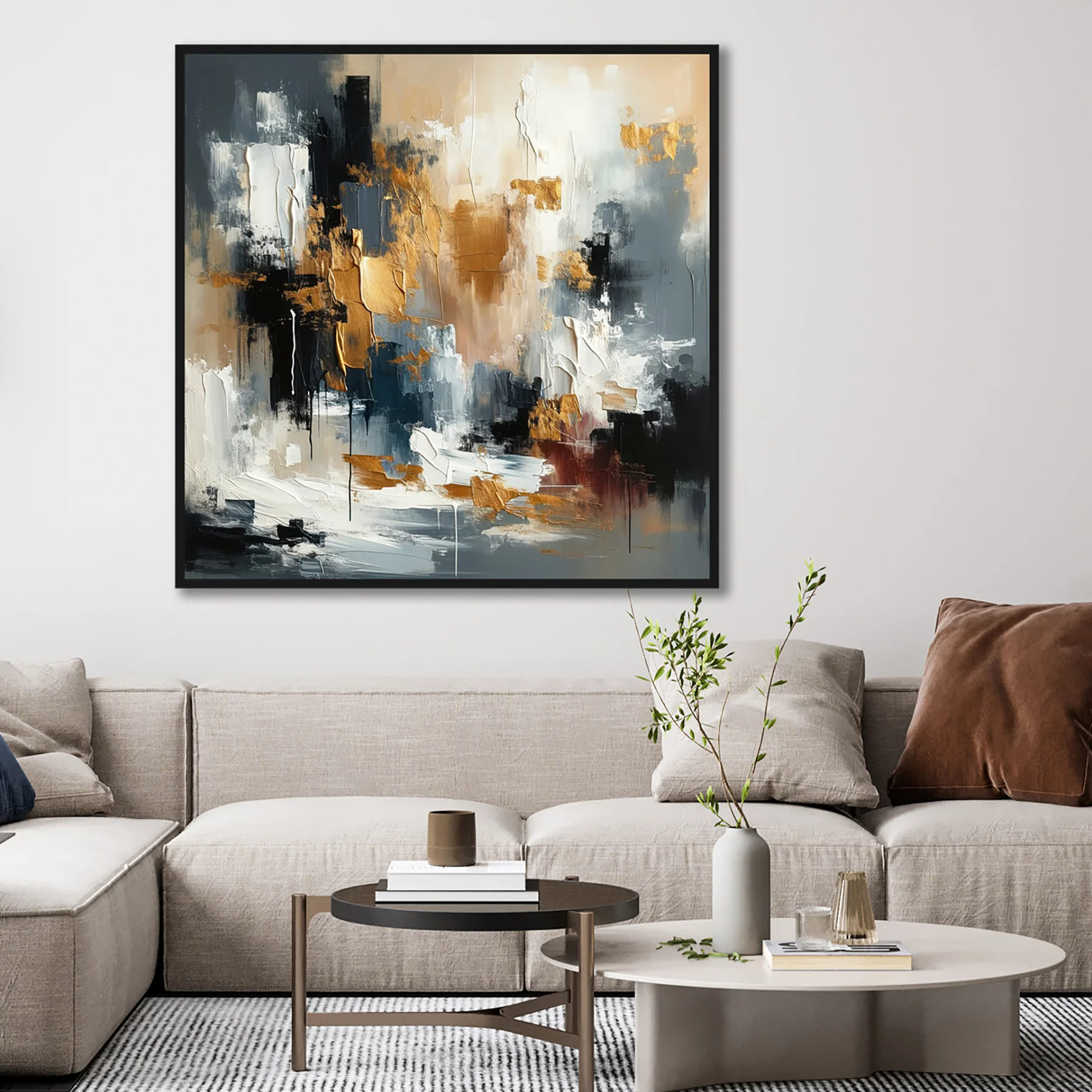 Yağlı Boya Dokulu Tablo Bej Altın Modern Çizimler Altın Çerçeveli