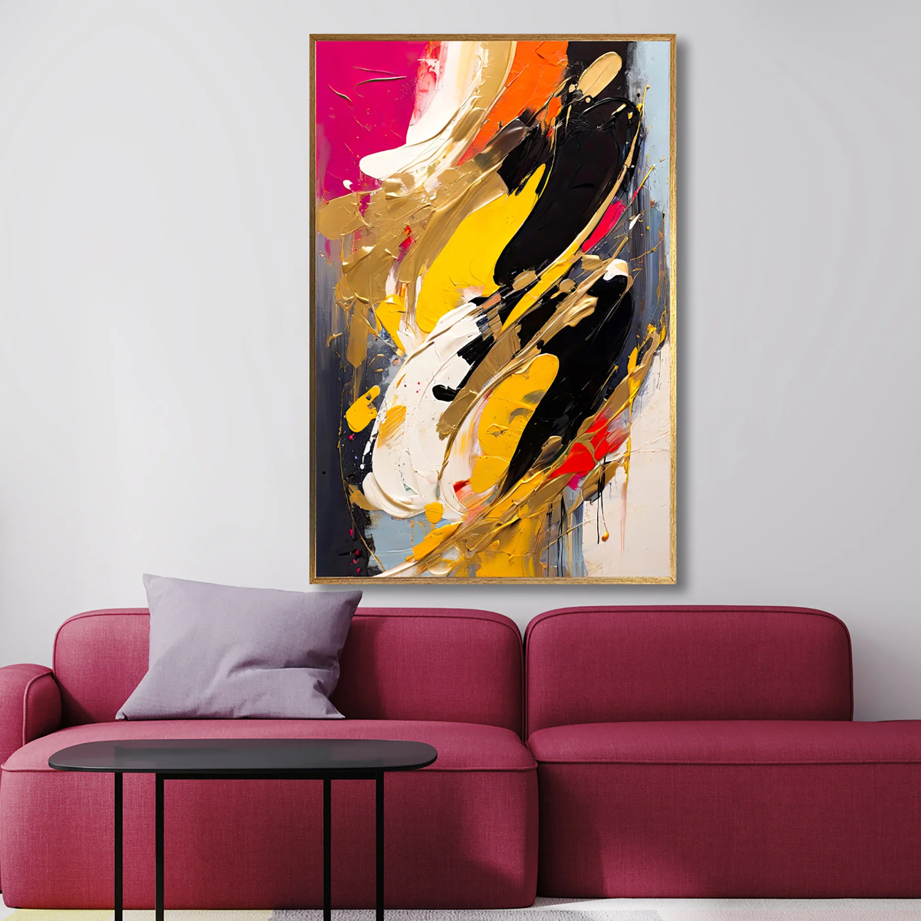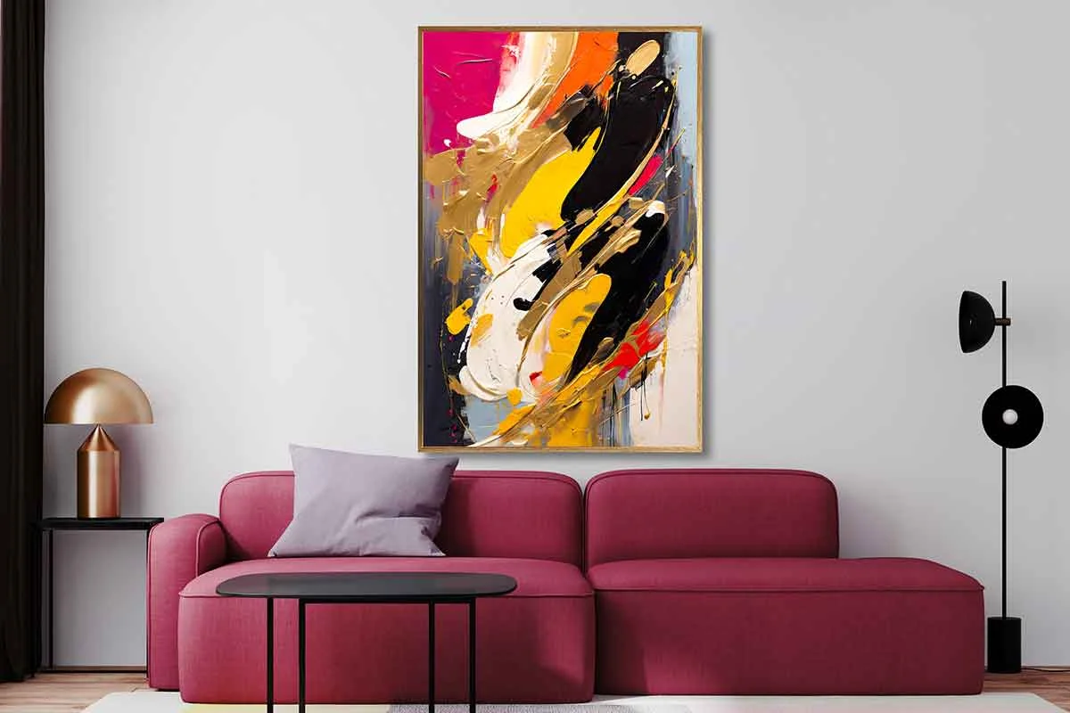 Yağlı Boya Dokulu Tablo Sarı Siyah Fuşya Soyut Altın Çerçeveli