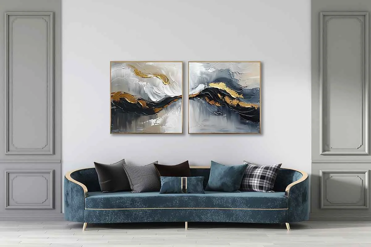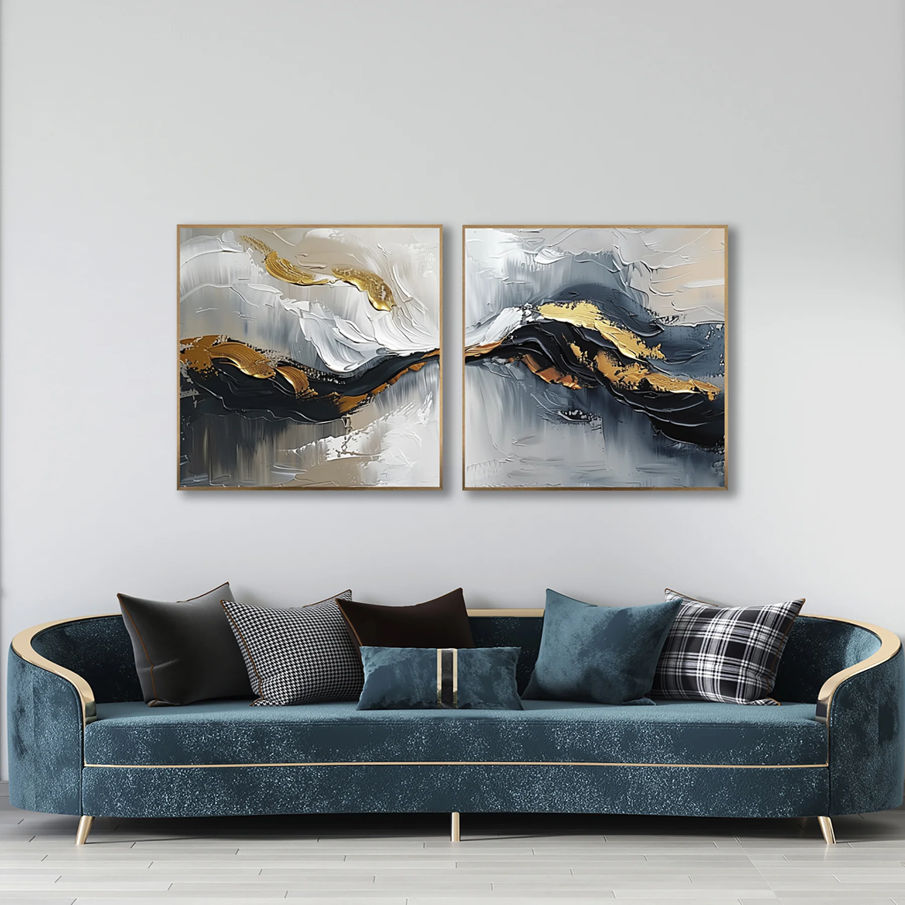 Yağlı Boya Dokulu Tablo Siyah Altın Gri İkili Set Altın Çerçeveli