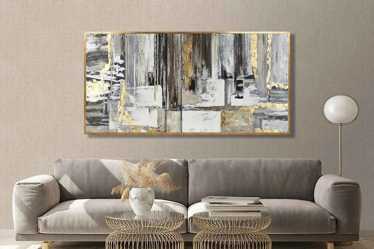 Yağlı Boya Dokulu Tablo Siyah Beyaz Altın Soyut Altın Çerçeveli