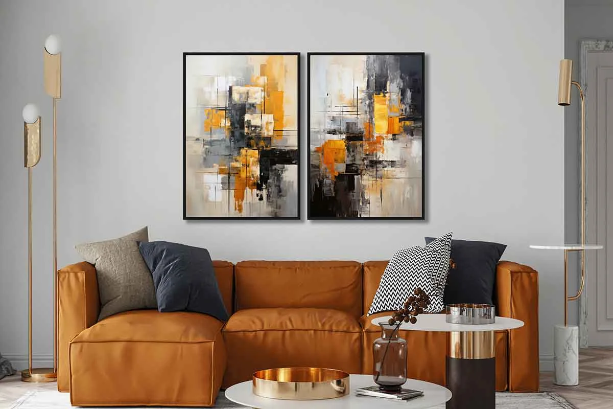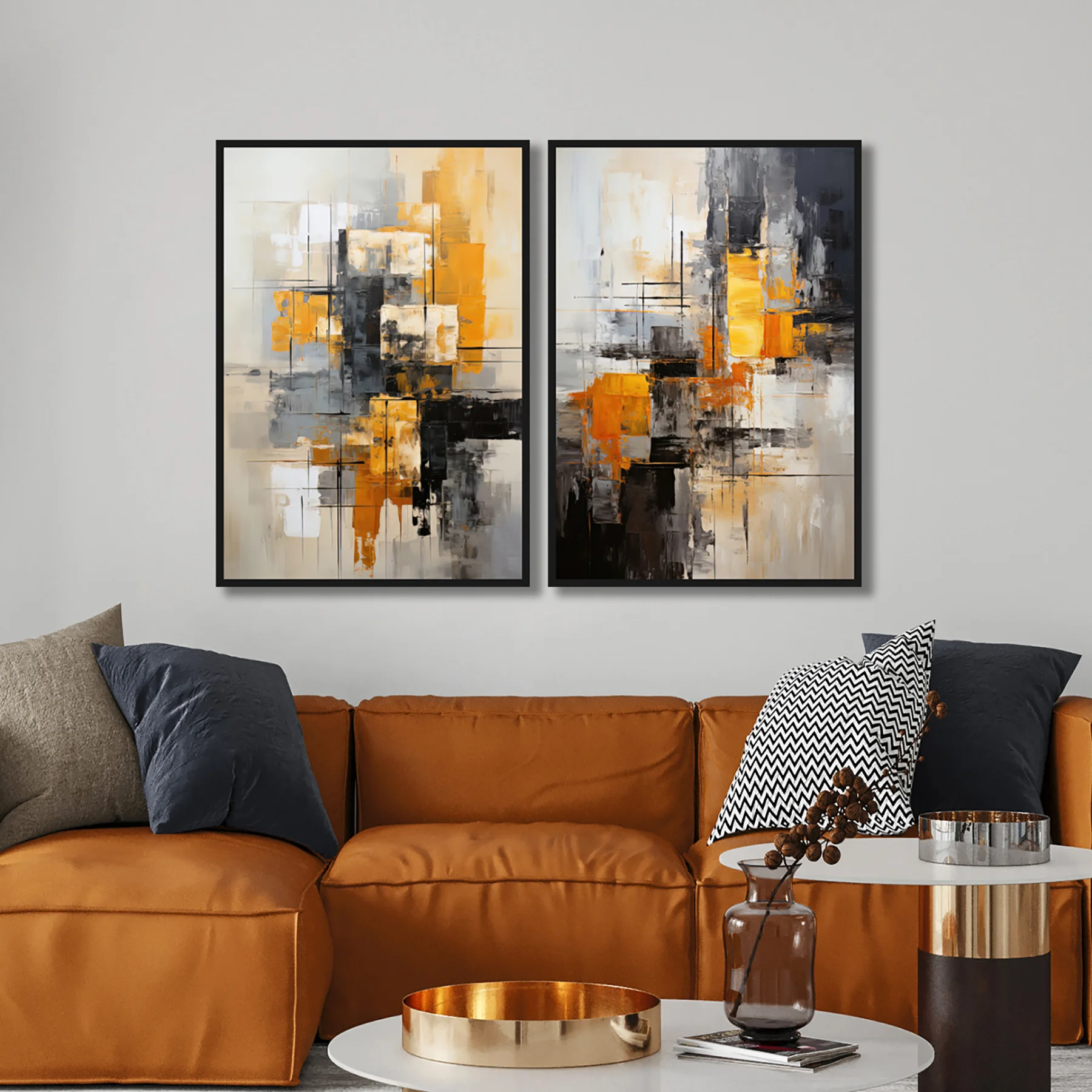 Yağlı Boya Dokulu Tablo Siyah Beyaz Kahve Soyut İkili Set Siyah Çerçeveli
