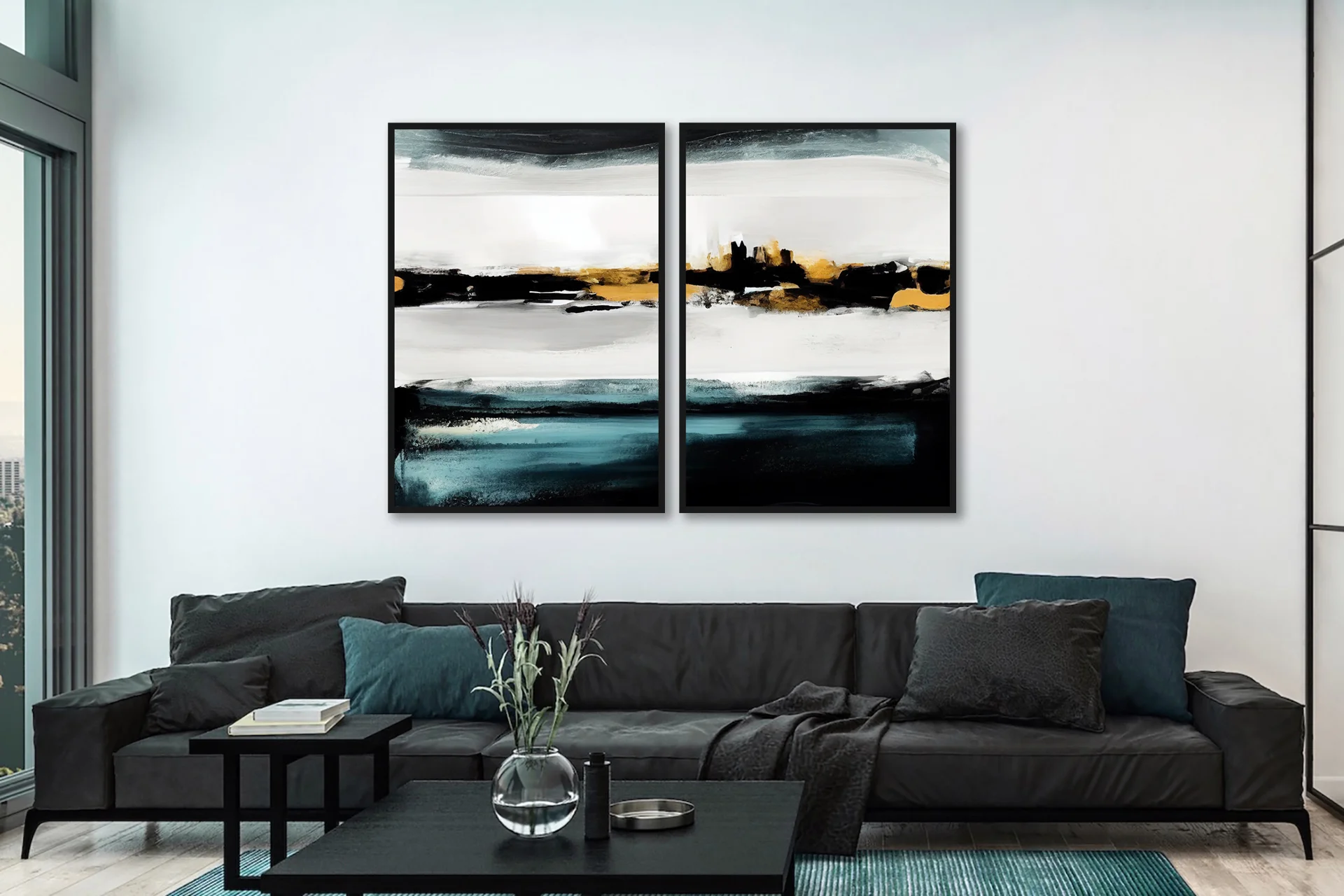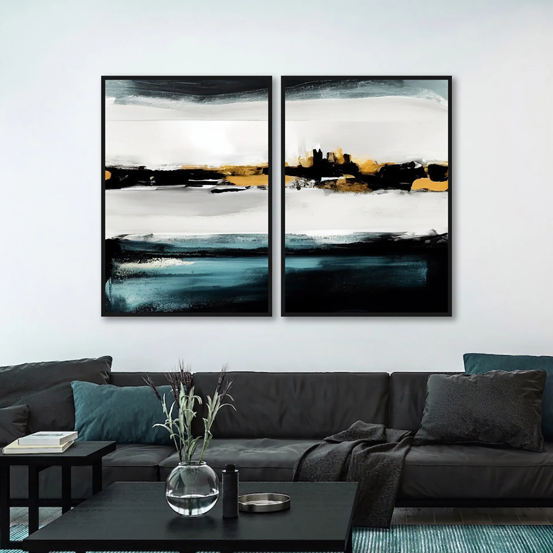 Yağlı Boya Dokulu Tablo Soyut Manzara İkili Set Siyah Çerçeveli