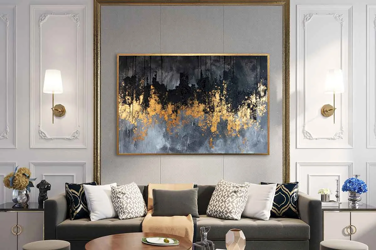 Yağlı Boya Dokulu Tablo Siyah Gri Altın Şehir Manzara Altın Çerçeveli