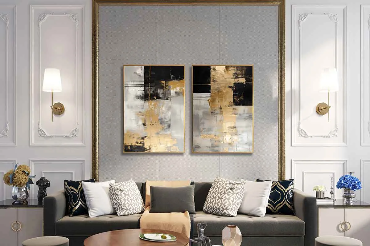 Yağlı Boya Dokulu Tablo Siyah Gri Altın Soyut İkili Set Altın Çerçeveli