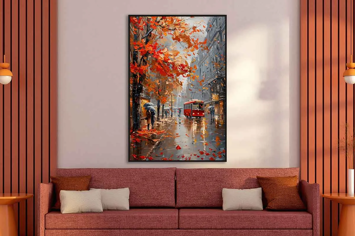 Yağlı Boya Dokulu Tablo Sonbahar Şehir Manzarası Siyah Çerçeveli
