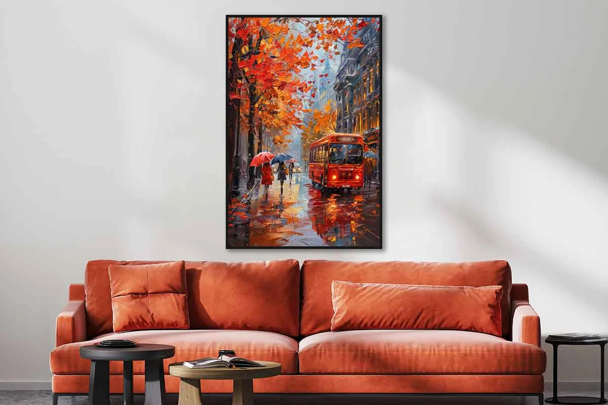 Yağlı Boya Dokulu Tablo Sonbahar Şehir Manzarası Siyah Çerçeveli