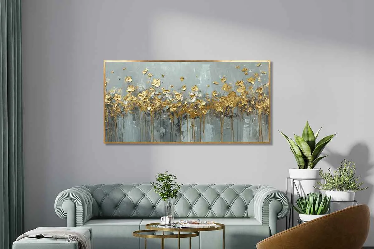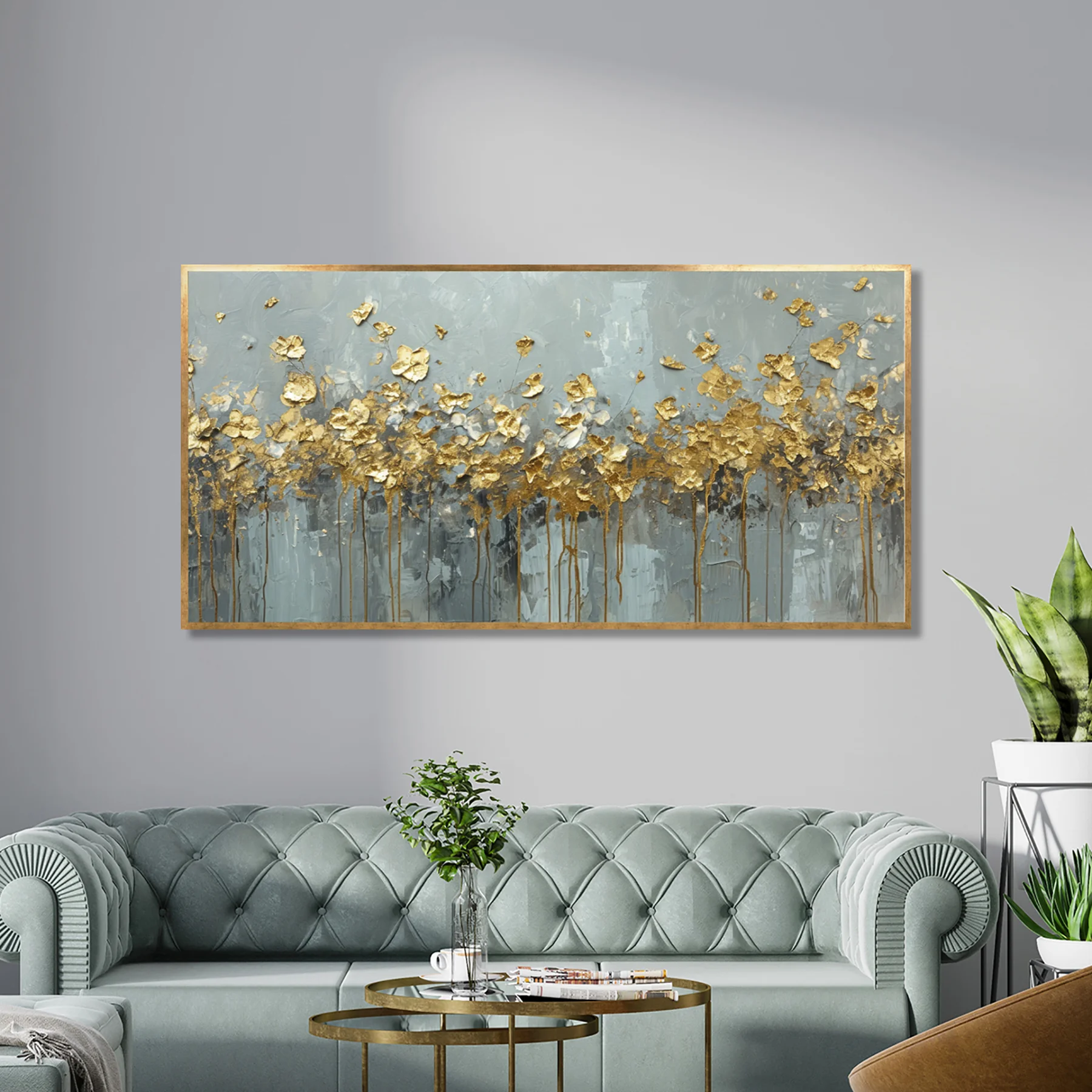 Yağlı Boya Dokulu Tablo Soyut Altın Çiçekler Altın Çerçeveli