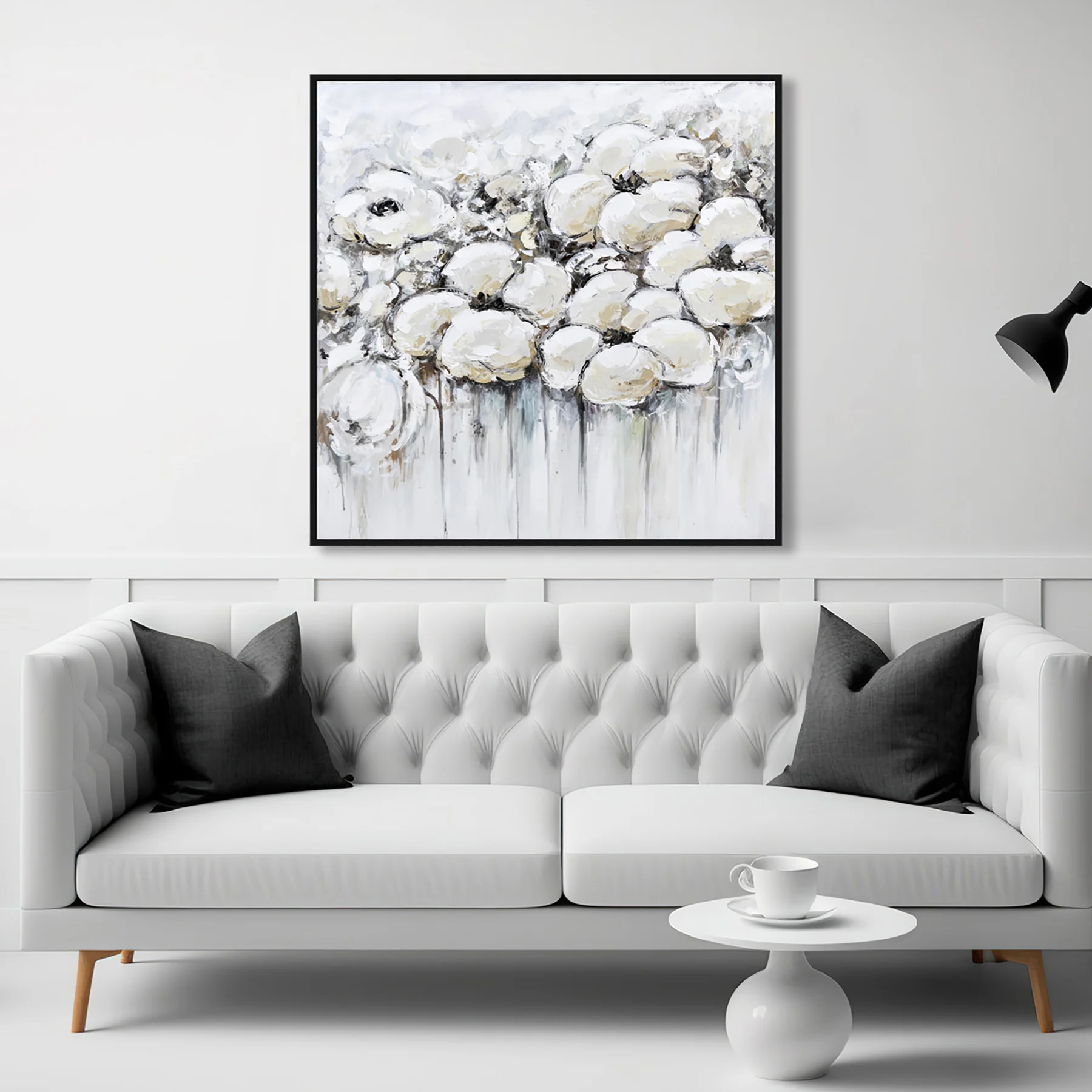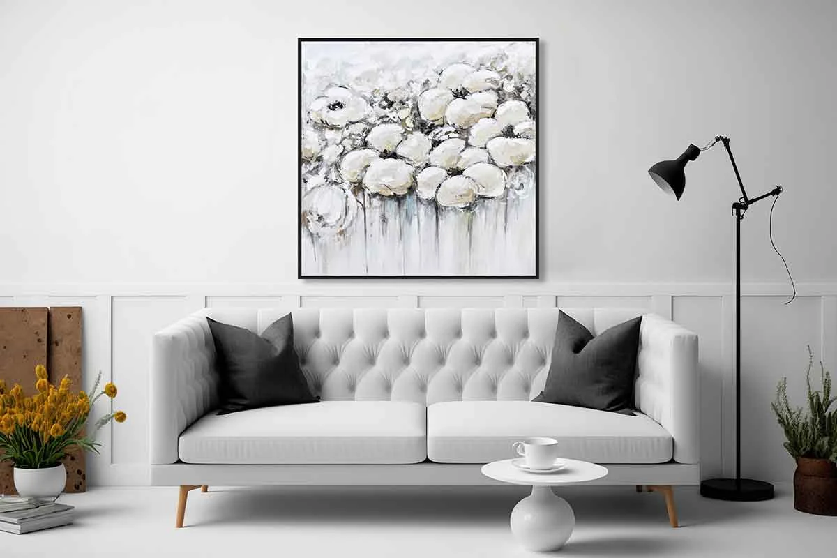 Yağlı Boya Dokulu Tablo Soyut Beyaz Çiçekler Siyah Çerçeveli