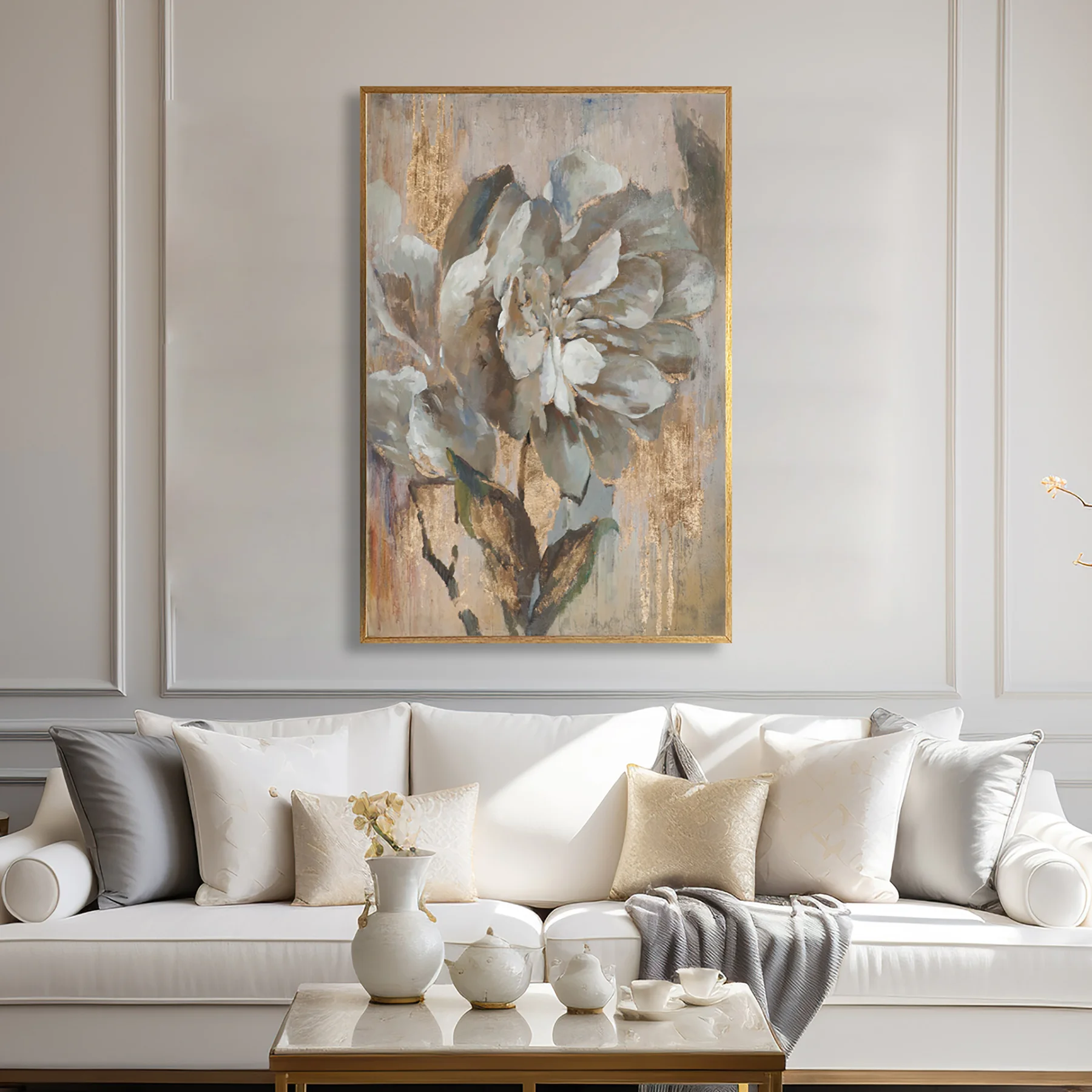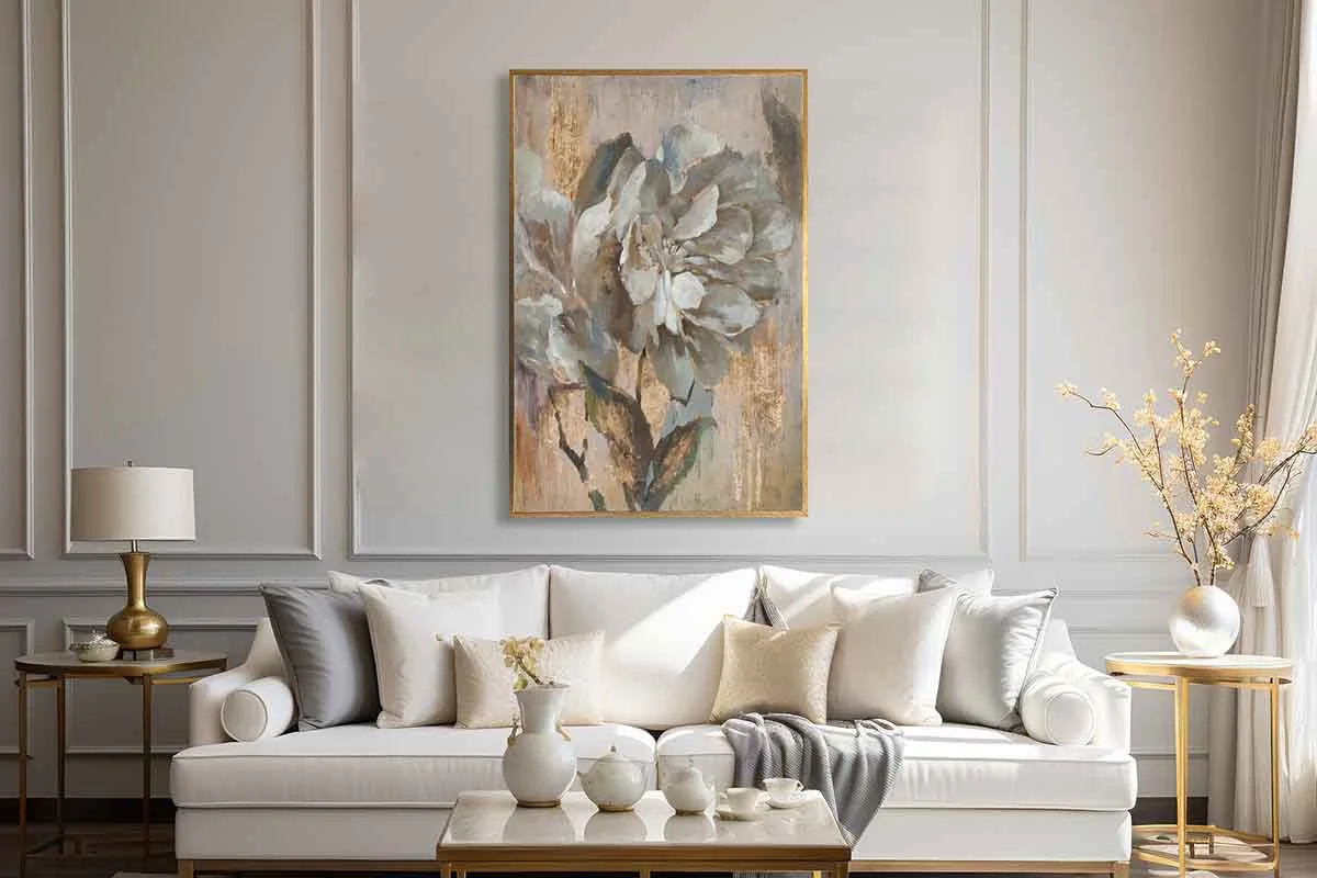 Yağlı Boya Dokulu Tablo Soyut Beyaz Tek Çiçek Altın Çerçeveli