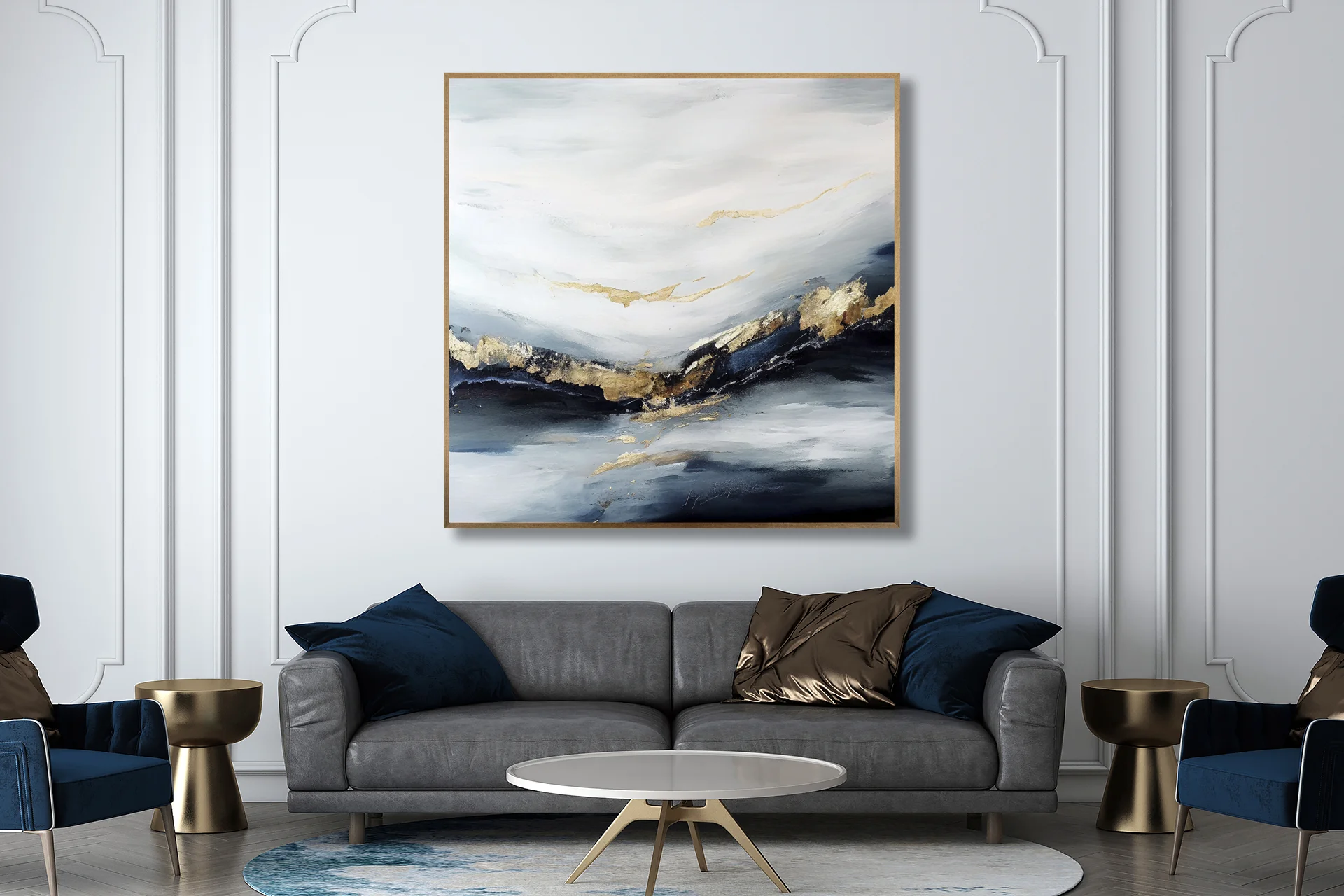 Yağlı Boya Dokulu Tablo Gri Beyaz Bej Soyut Altın Çerçeveli