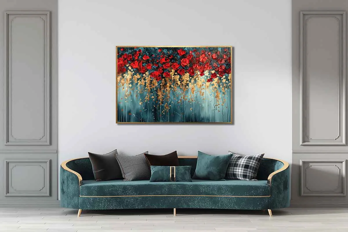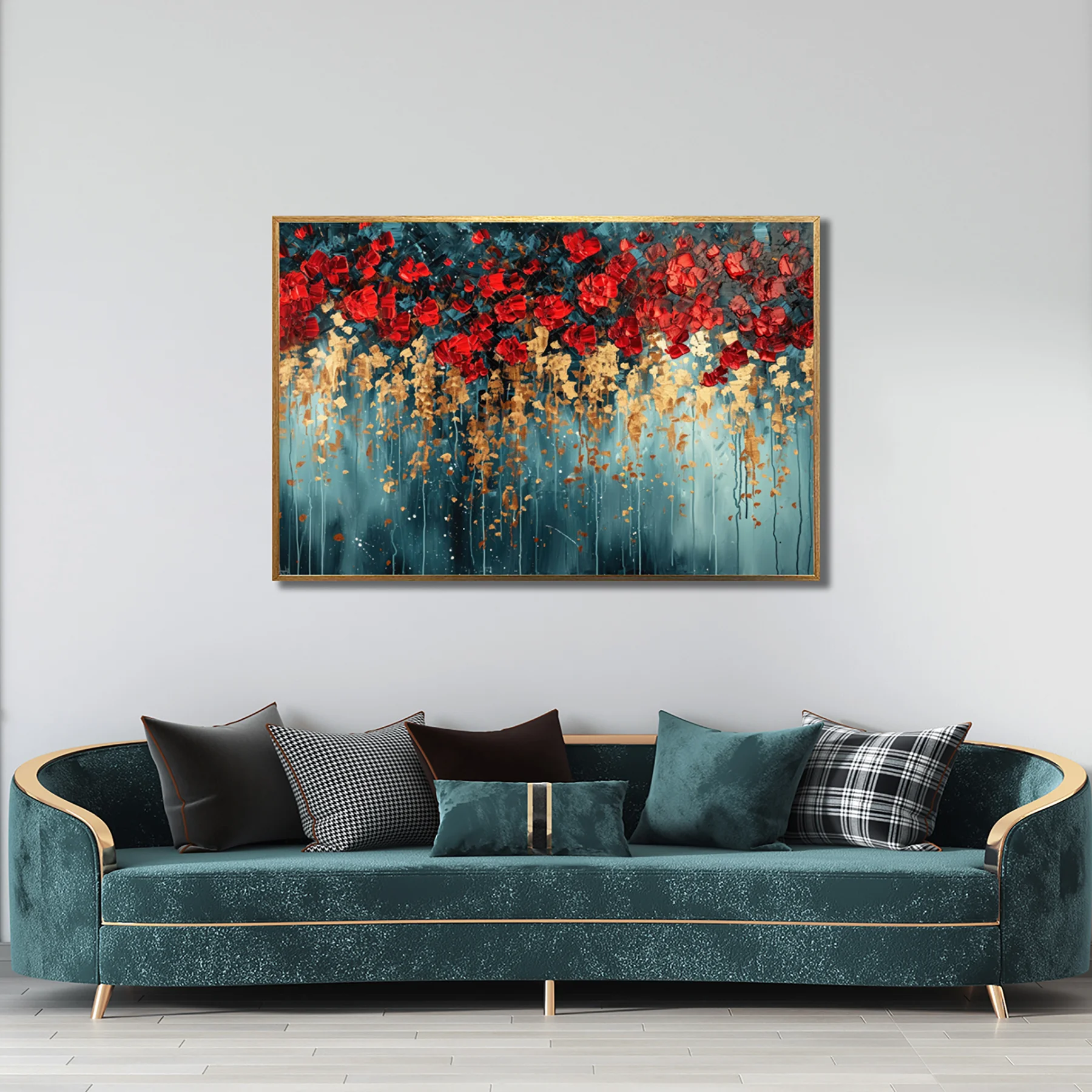 Yağlı Boya Dokulu Tablo Soyut Kırmızı Çiçekler Altın Çerçeveli