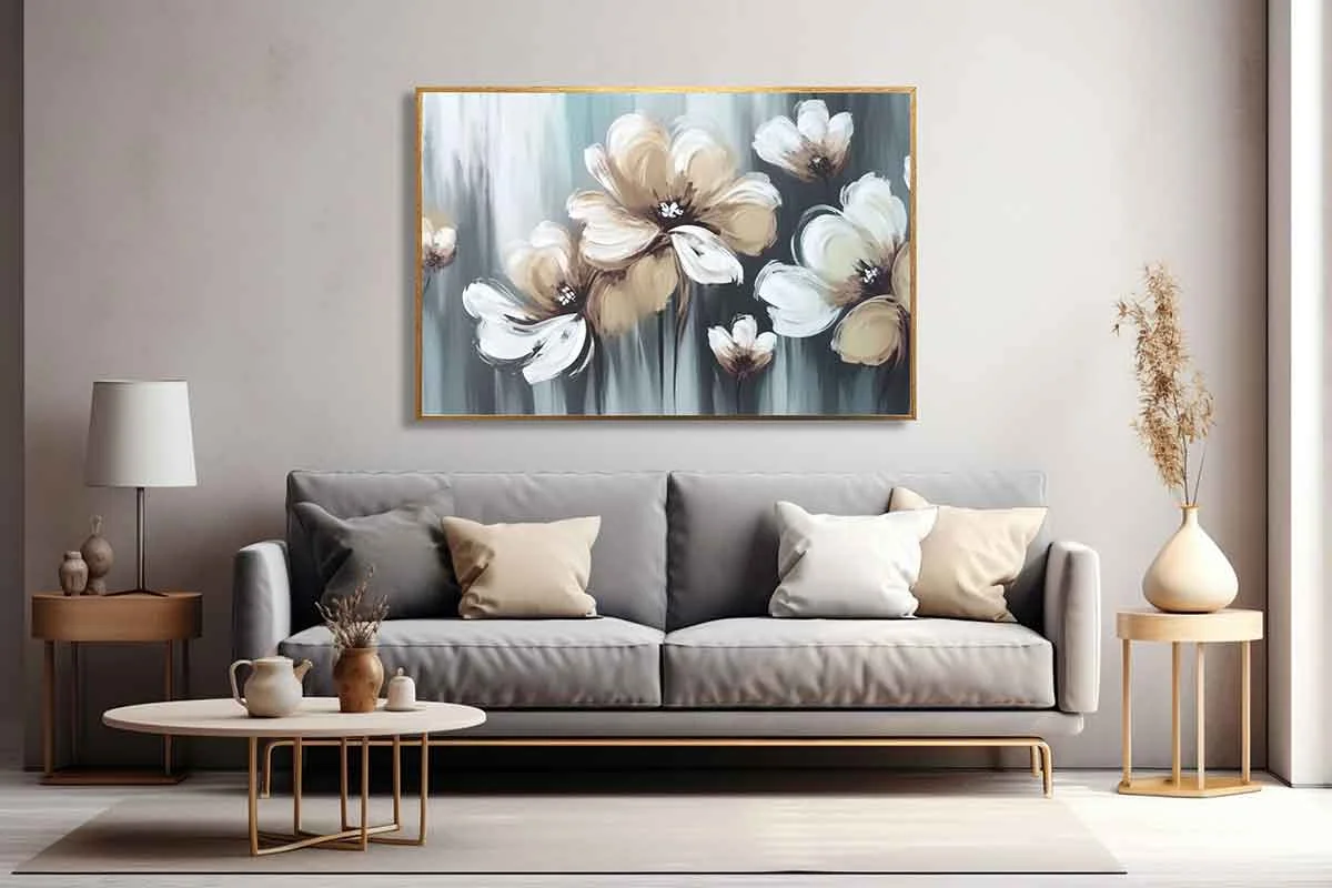 Yağlı Boya Dokulu Tablo Soyut Krem Beyaz Çiçekler Altın Çerçeveli