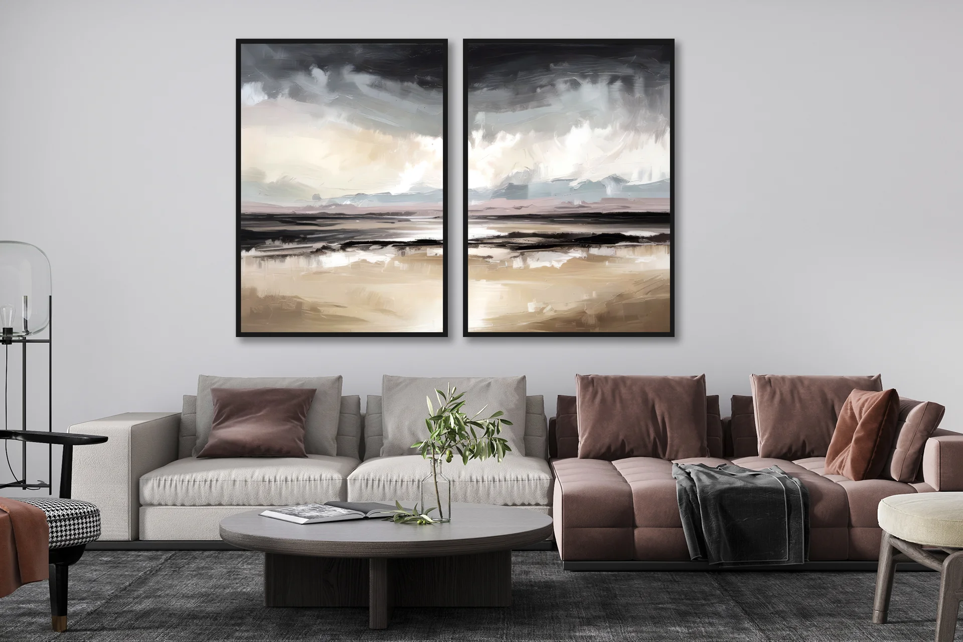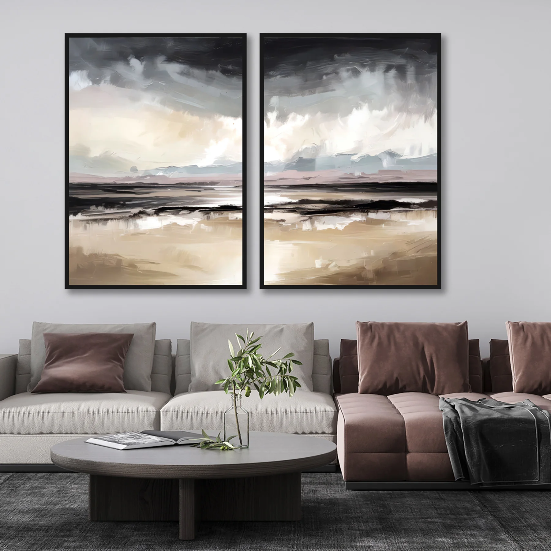 Yağlı Boya Dokulu Tablo Soyut Manzara İkili Set Siyah Çerçeveli