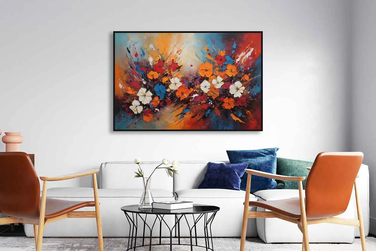 Yağlı Boya Dokulu Tablo Soyut Renkli Bahar Çiçekleri Siyah Çerçeveli