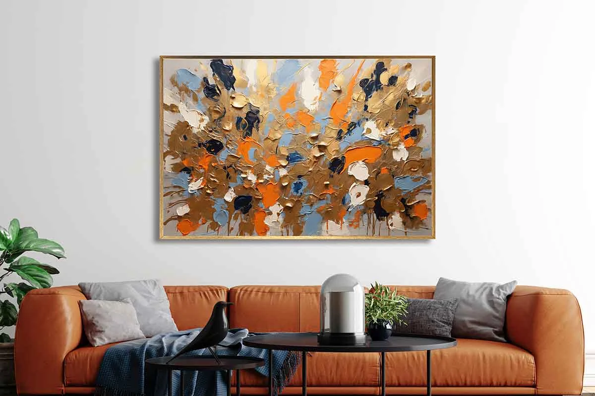 Yağlı Boya Dokulu Tablo Soyut Renkli Çiçekler Altın Çerçeveli