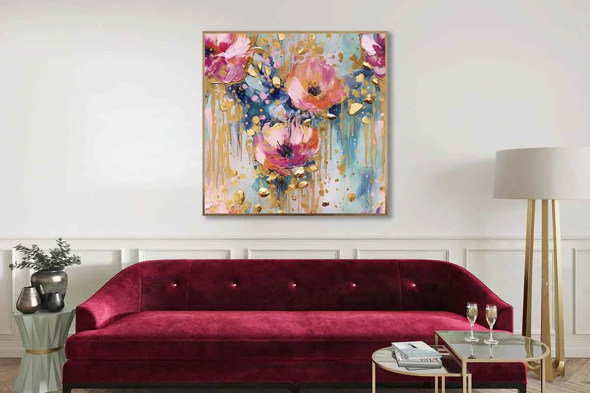 Etiketler: Altın, Çiçekler, Kare, Renkli, Soyut, Yağlı Boya Dokulu Tablo