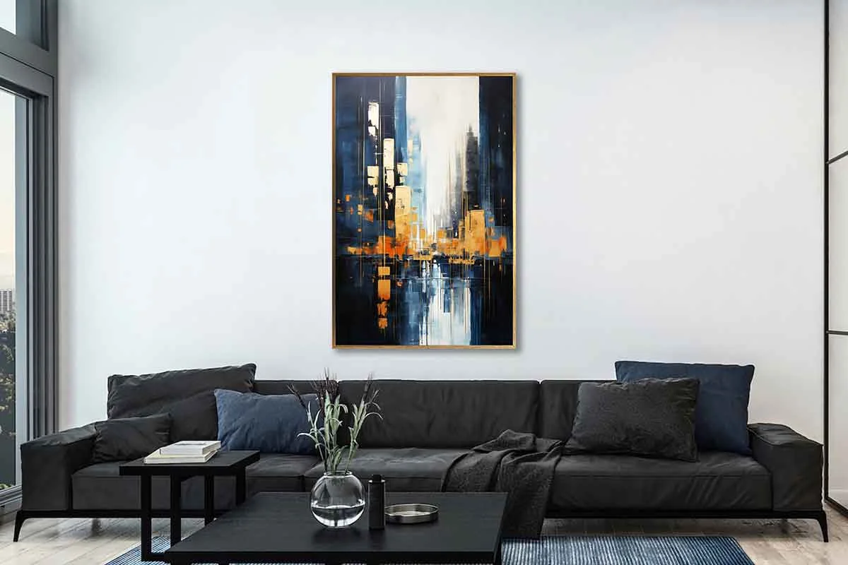 Yağlı Boya Dokulu Tablo Soyut Şehir Manzarası Manhattan Altın Çerçeveli