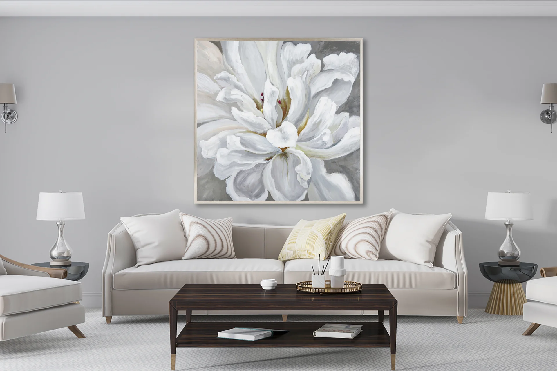 Yağlı Boya Dokulu Tablo Soyut Tekli Beyaz Çiçek Gümüş Çerçeveli