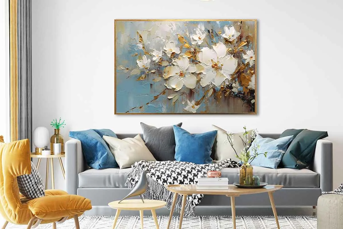 Yağlı Boya Dokulu Tablo Beyaz Çiçekler Altın Çerçeveli