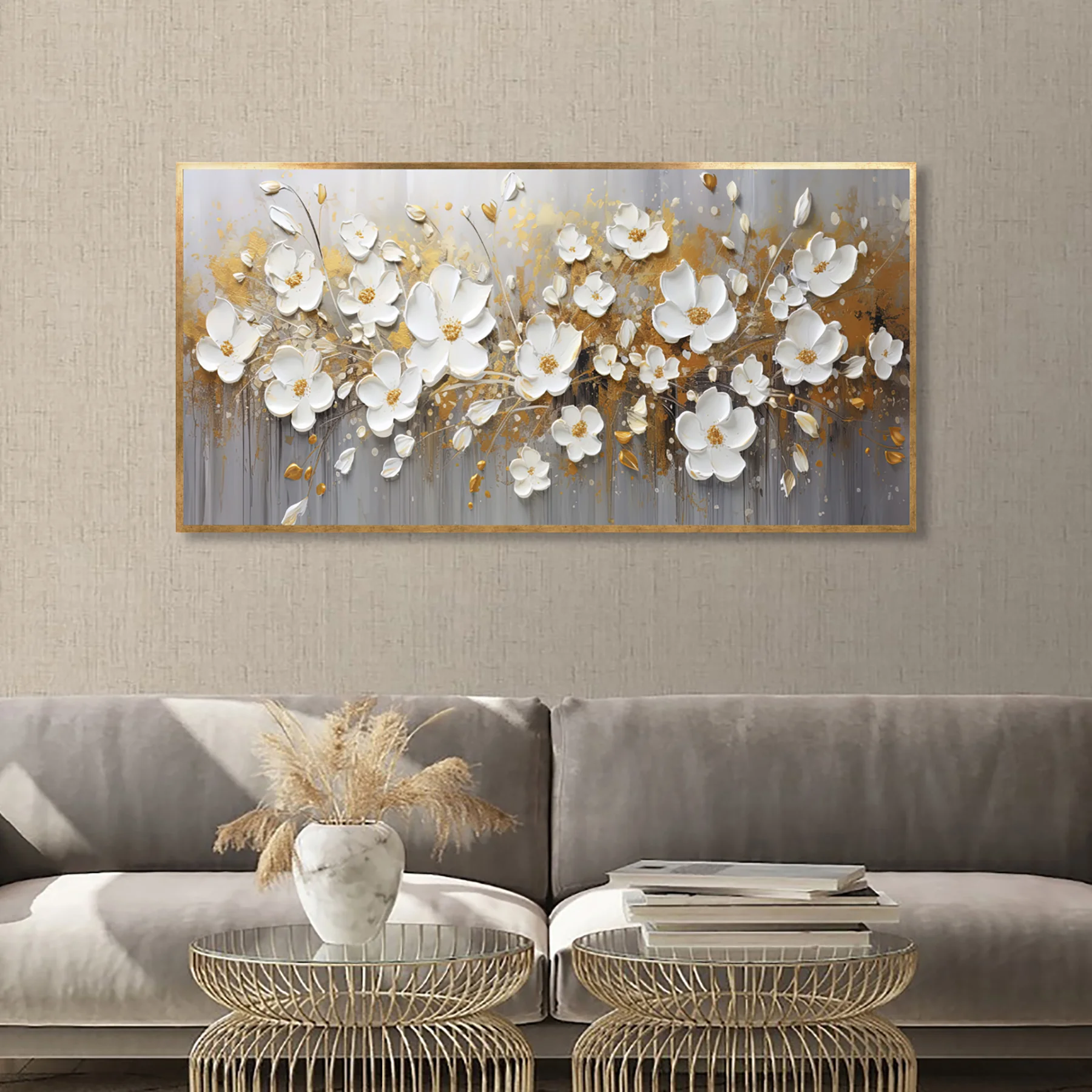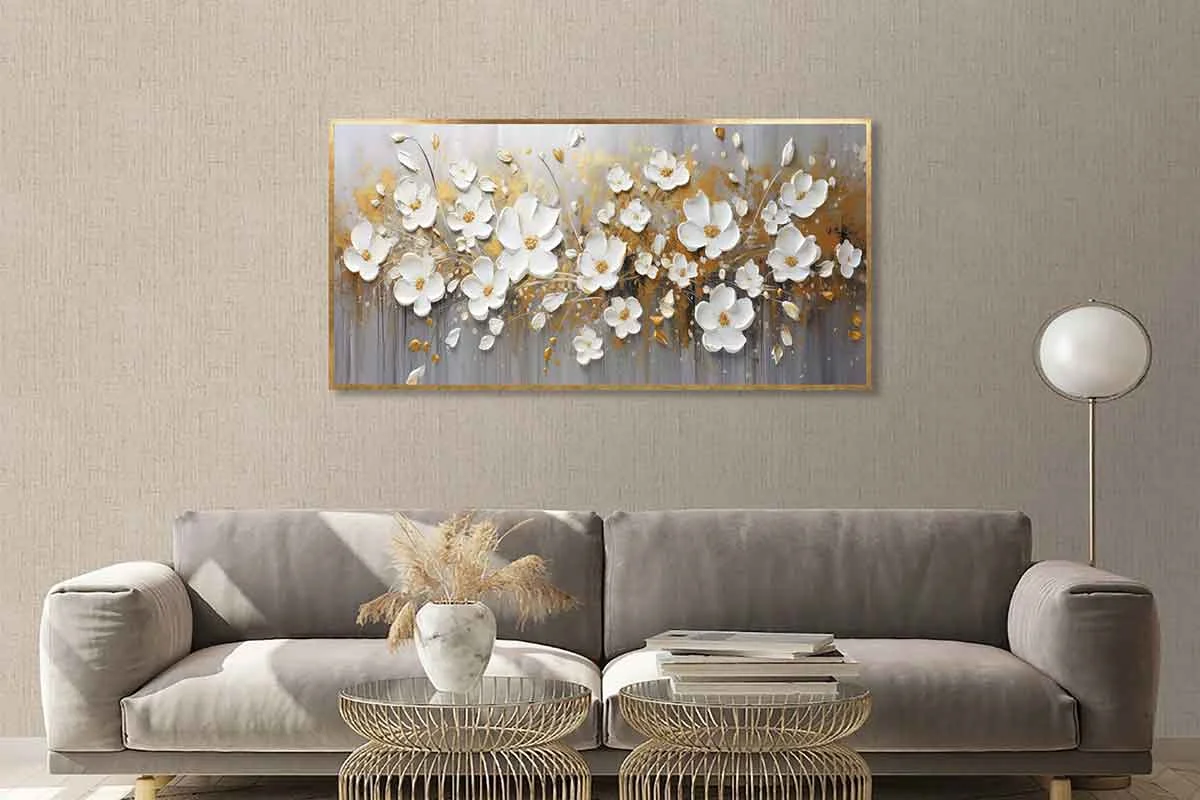 Yağlı Boya Dokulu Tablo Dalda Beyaz Papatyalar Altın Çerçeveli