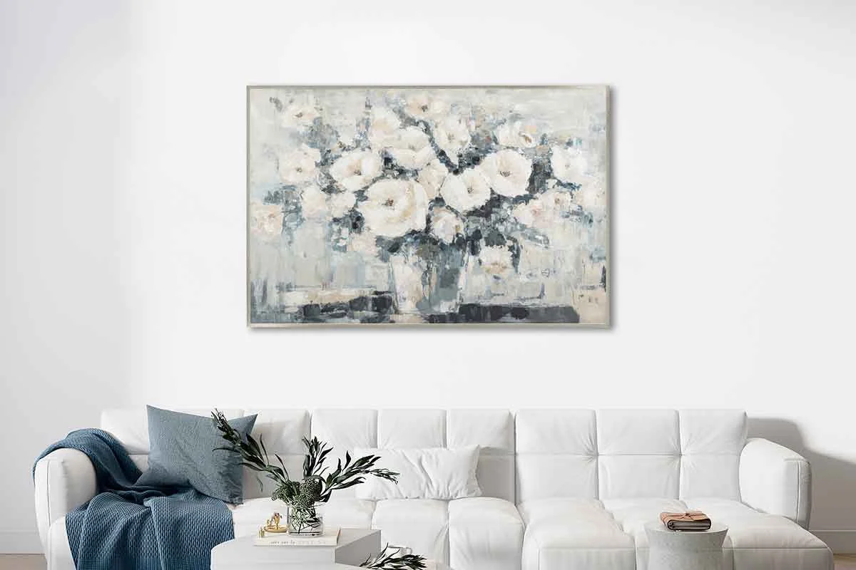 Etiketler: Beyaz, Çiçekler, Gümüş, Vazoda, Yağlı Boya Dokulu Tablo, Yatay