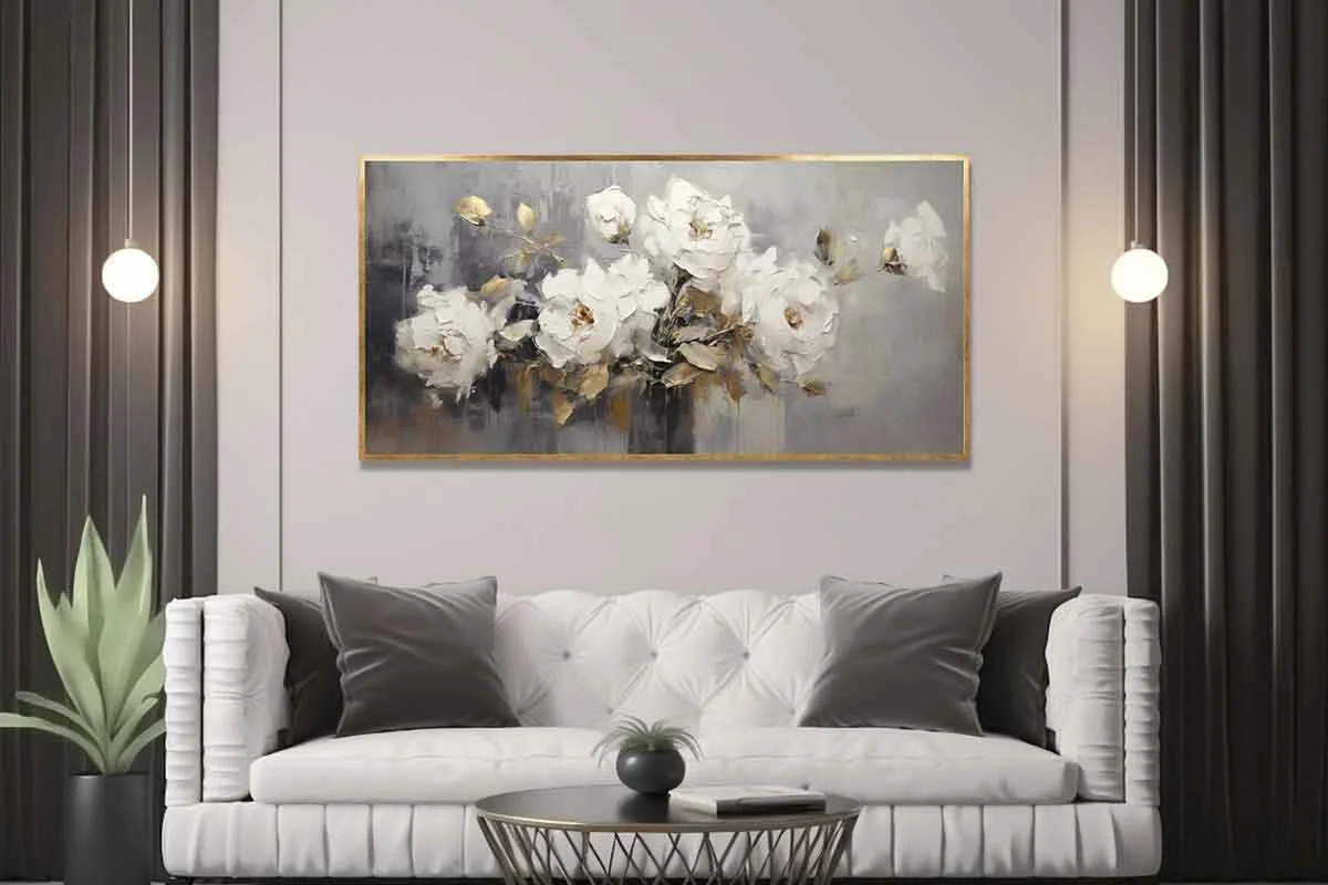 Etiketler: Altın, Beyaz, Çiçekler, Modern, Vazoda, Yağlı Boya Dokulu Tablo, Yatay