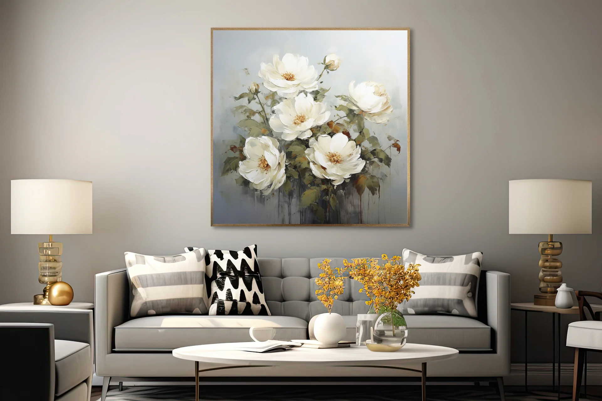 Yağlı Boya Dokulu Tablo Beyaz Modern Çiçekler Altın Çerçeveli