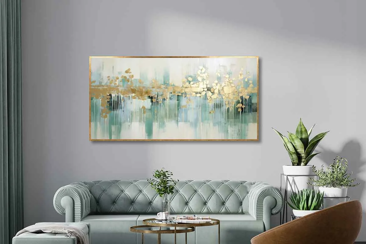 Yağlı Boya Dokulu Tablo Yeşil Altın Soyut Şehir Manzarası Altın Çerçeveli