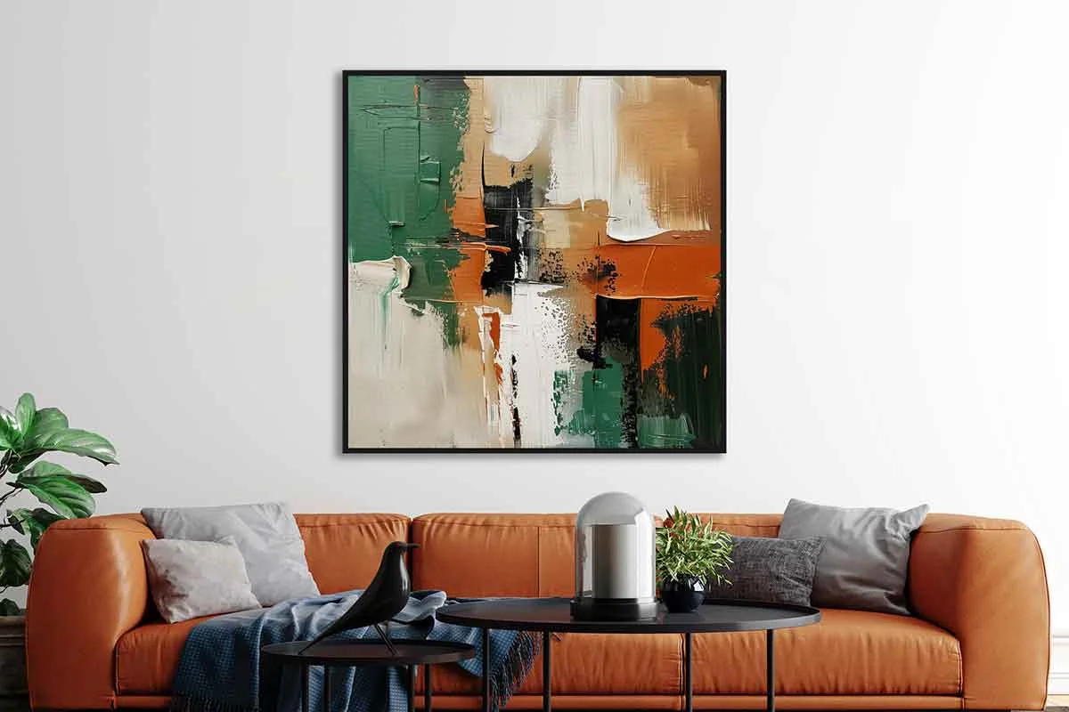 Yağlı Boya Dokulu Tablo Yeşil Bej Kare Soyut Siyah Çerçeveli
