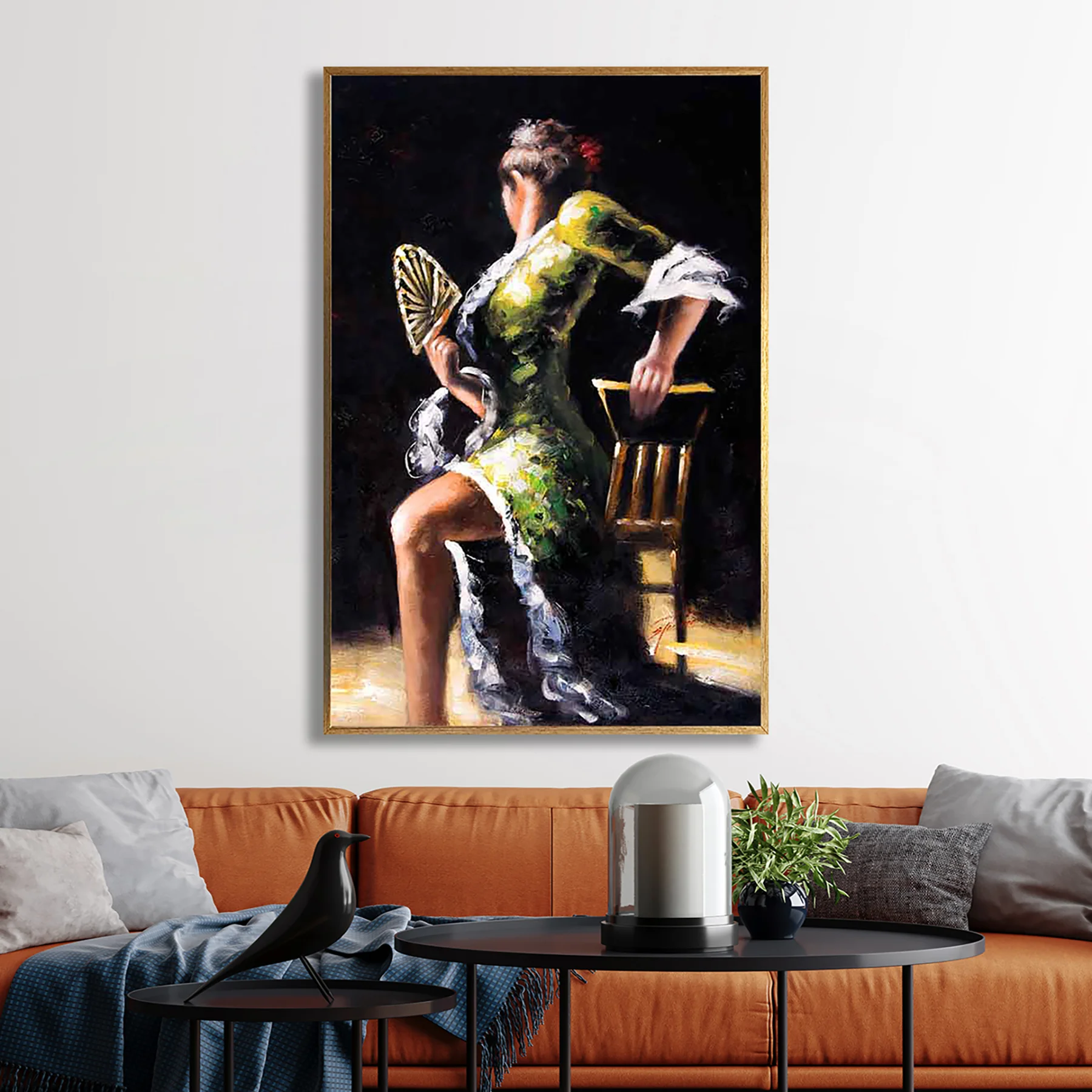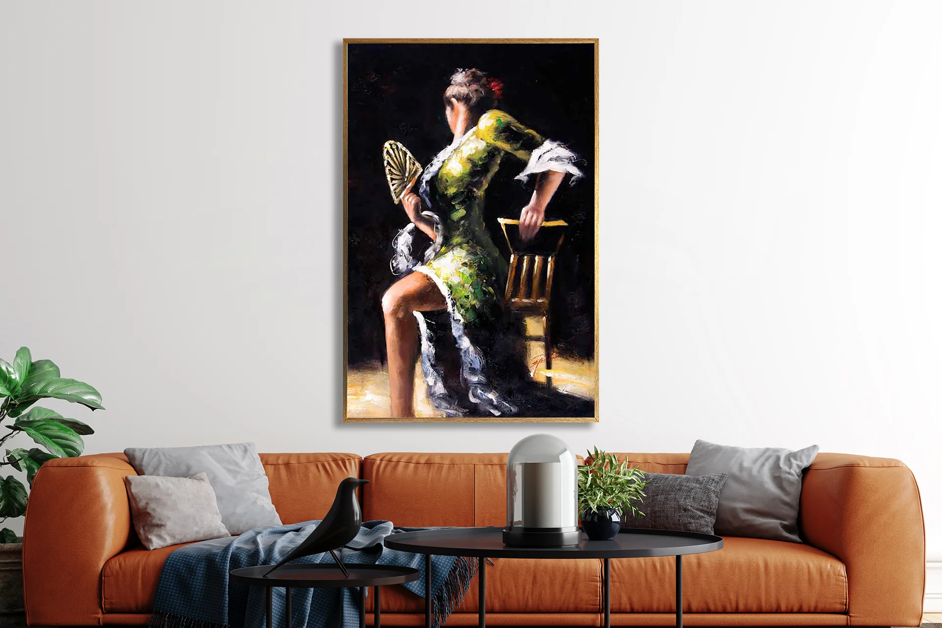 Yağlı Boya Dokulu Tablo Yeşil Elbiseli İspanyol Dansçı Kadın Altın Çerçeveli