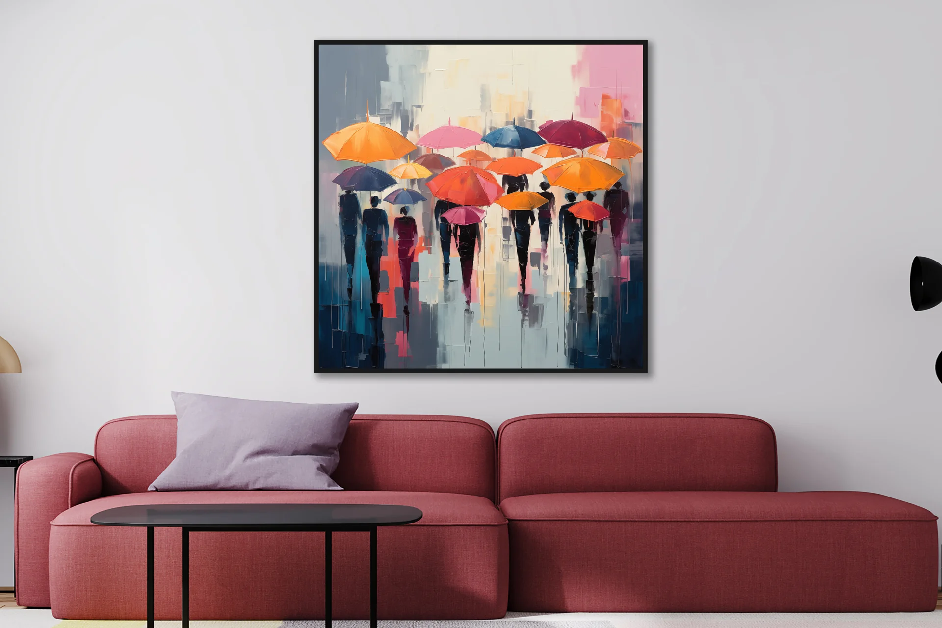 Yağlı Boya Dokulu Tablo Yürüyen Şemsiyeli İnsanlar Siyah Çerçeveli